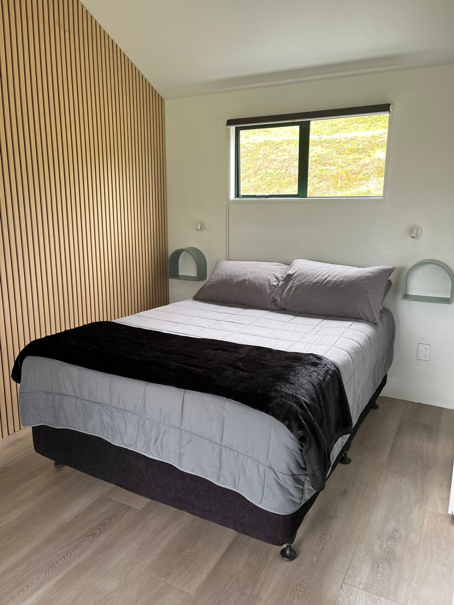 A cosy self-contained cabin featuring a brand-new bathroom, kitchenette, queen bed, and TV—everything you need for a comfortable stay.