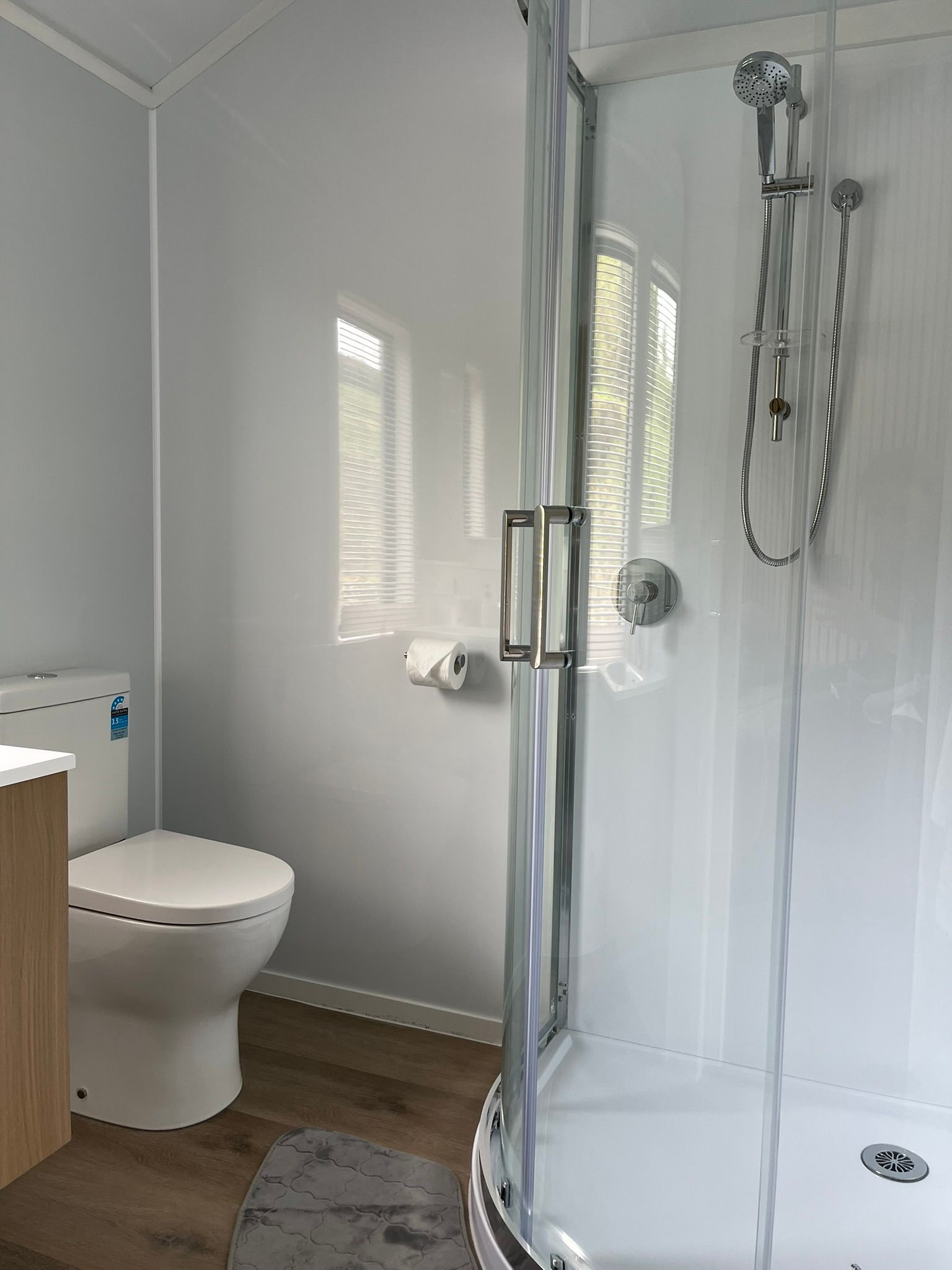 A cosy self-contained cabin featuring a brand-new bathroom, kitchenette, queen bed, and TV—everything you need for a comfortable stay.